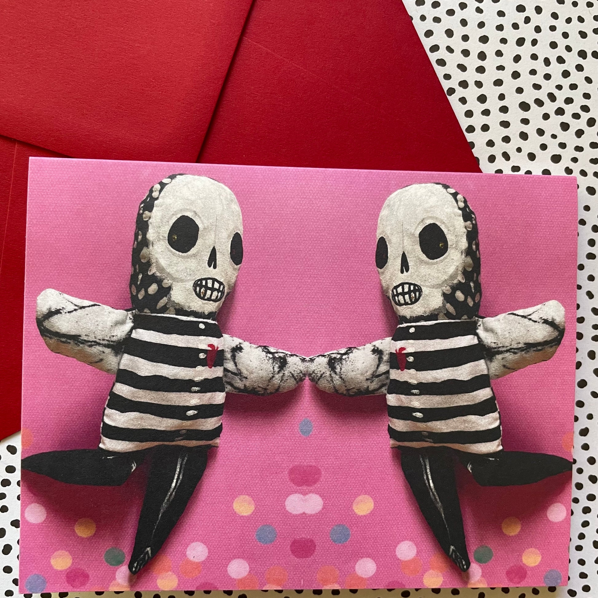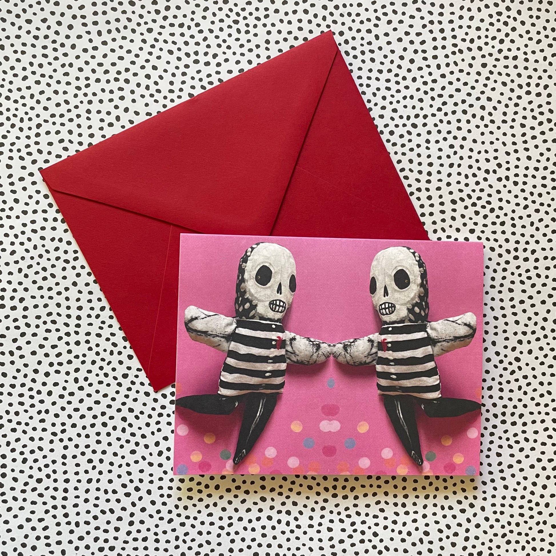 This is a print of one of my skeletons I’ve made throughout the years. I call it “Bailamos” meaning shall we dance in Spanish. I made it into a greeting card. I don’t know about you but I still love getting snail mail!