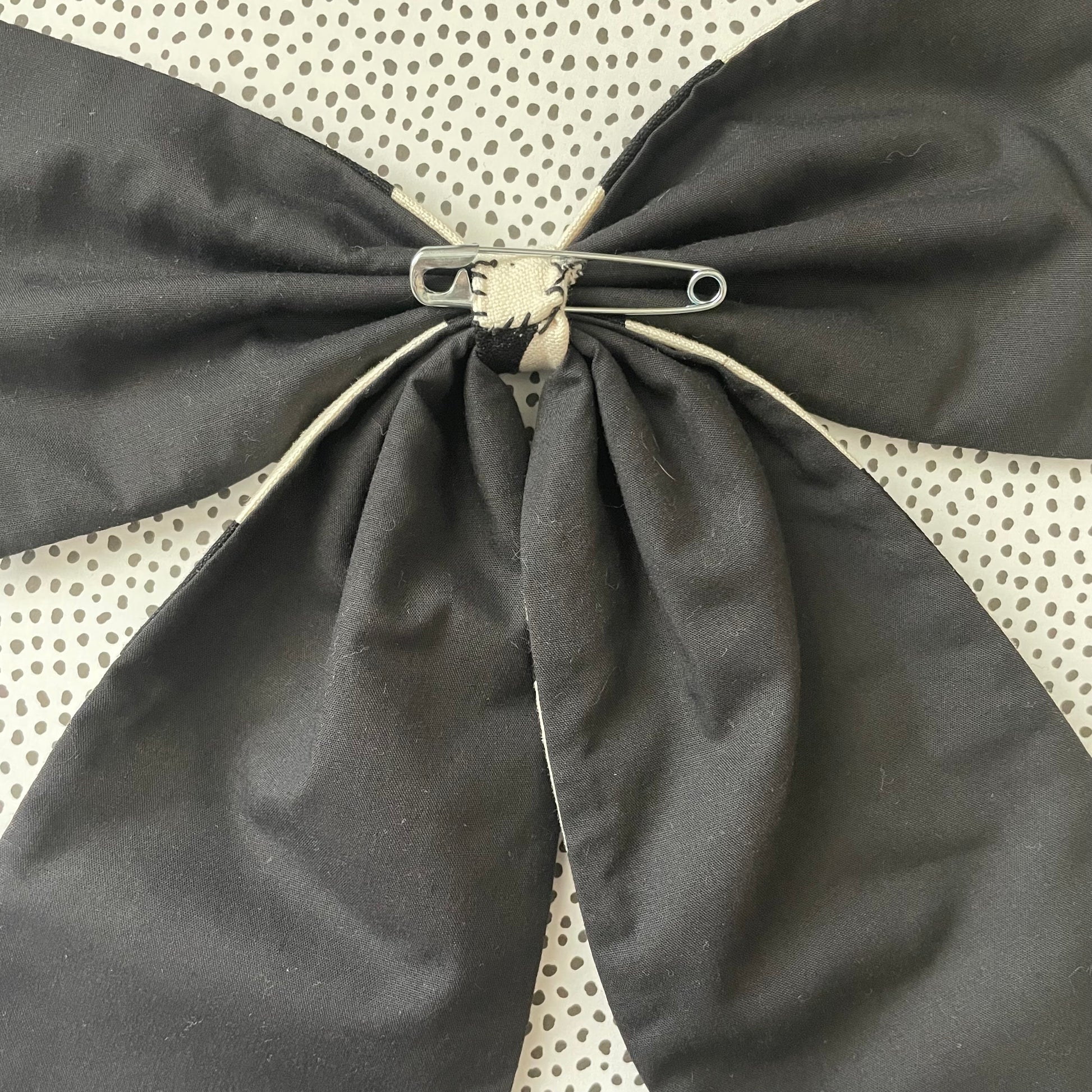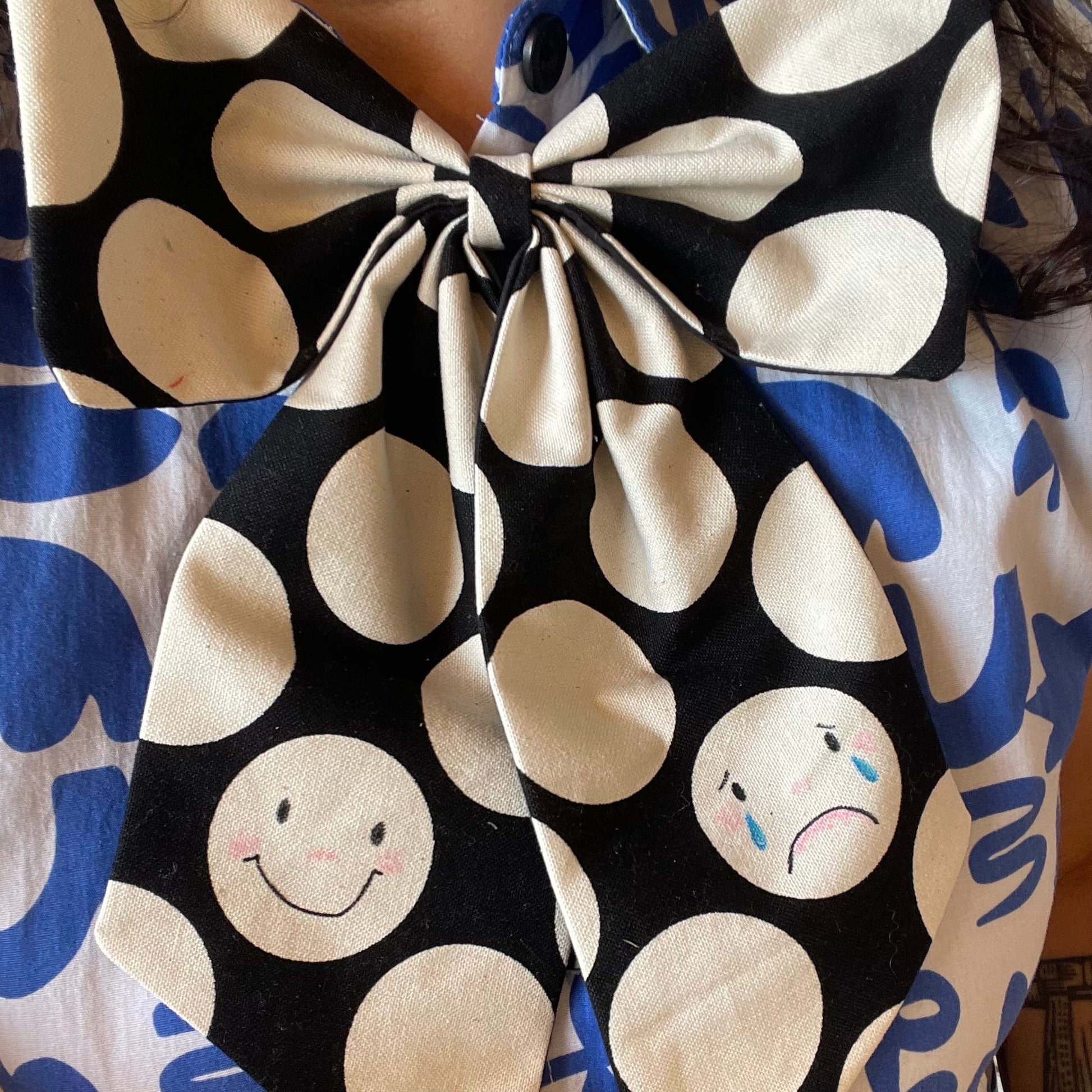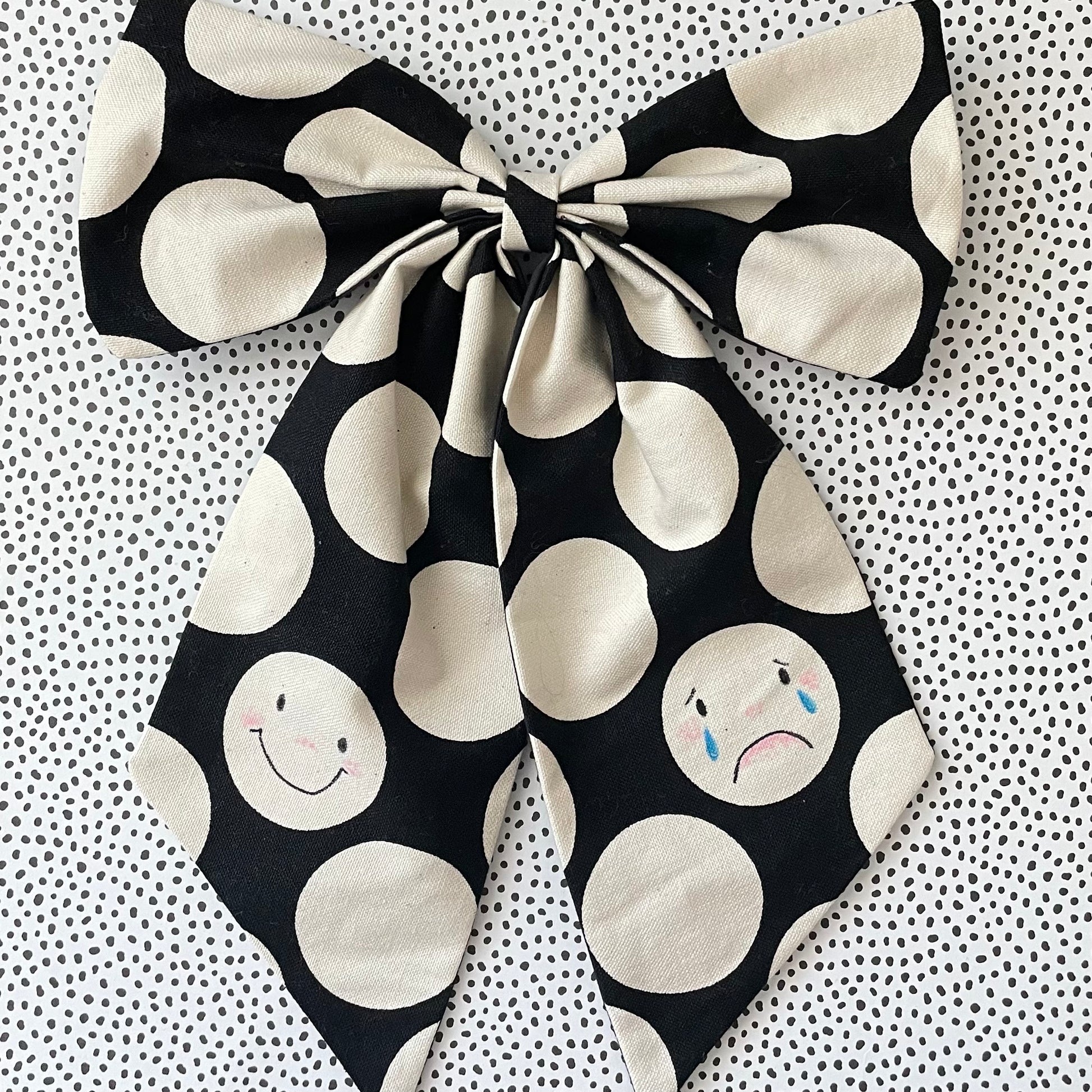 Handmade Big bow with a happy face and a sad face on each bow end. Attached with safety pin on any top.