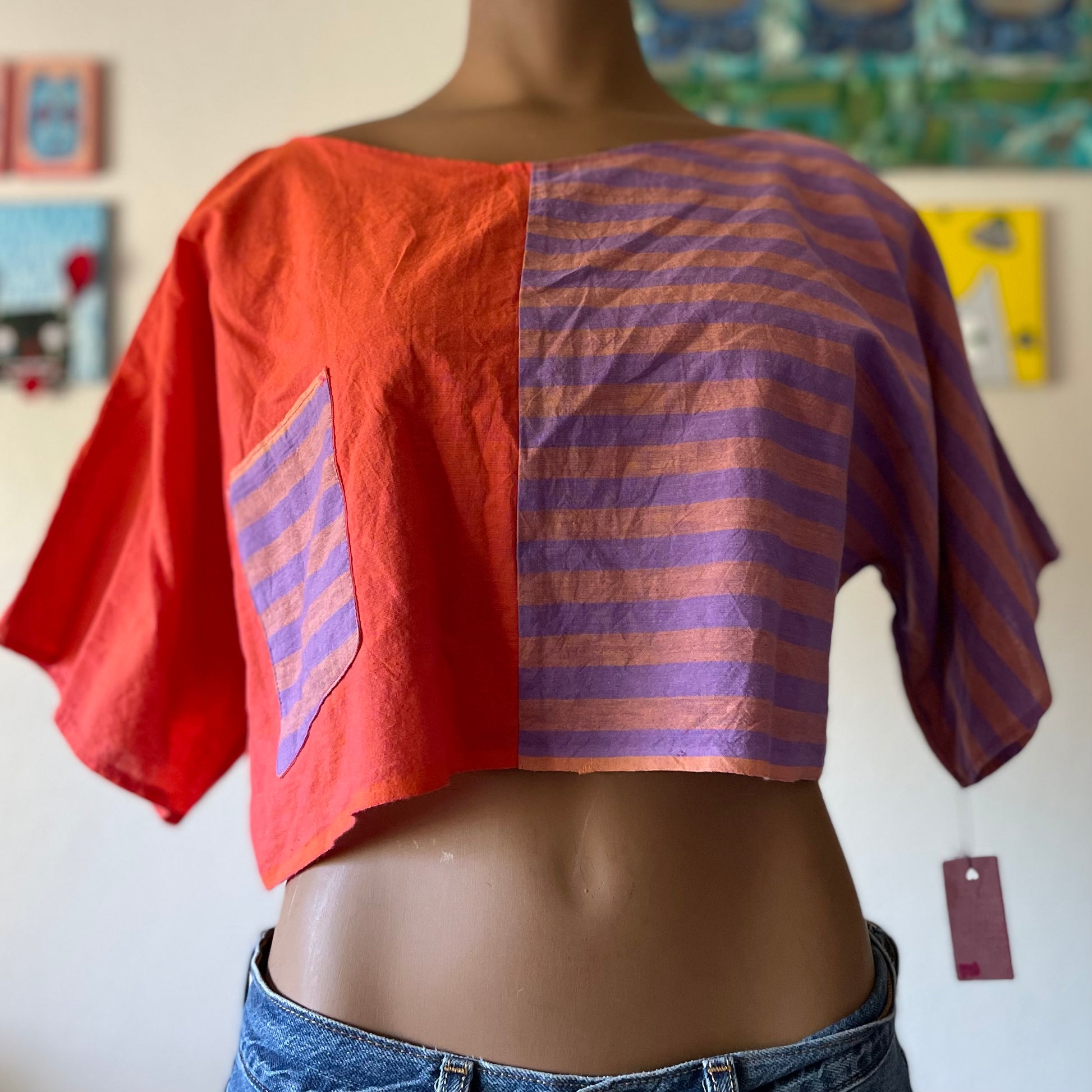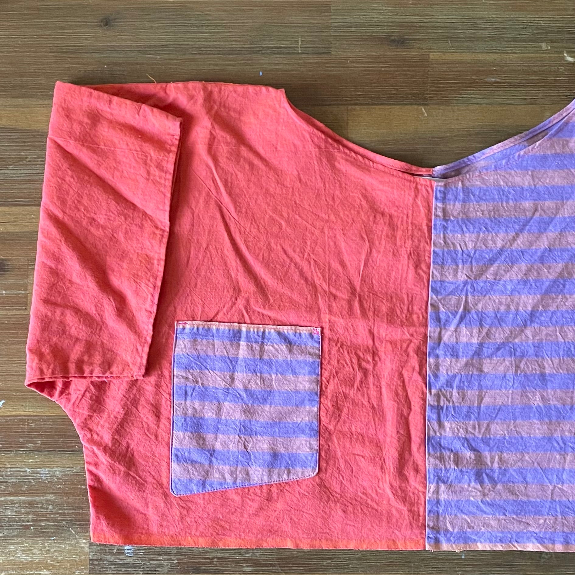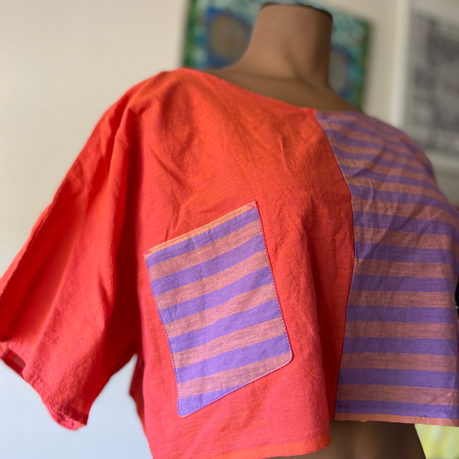 Handmade top made from cotton fabrics. 100% pre-shrunk cotton. Has a small pocket on front.