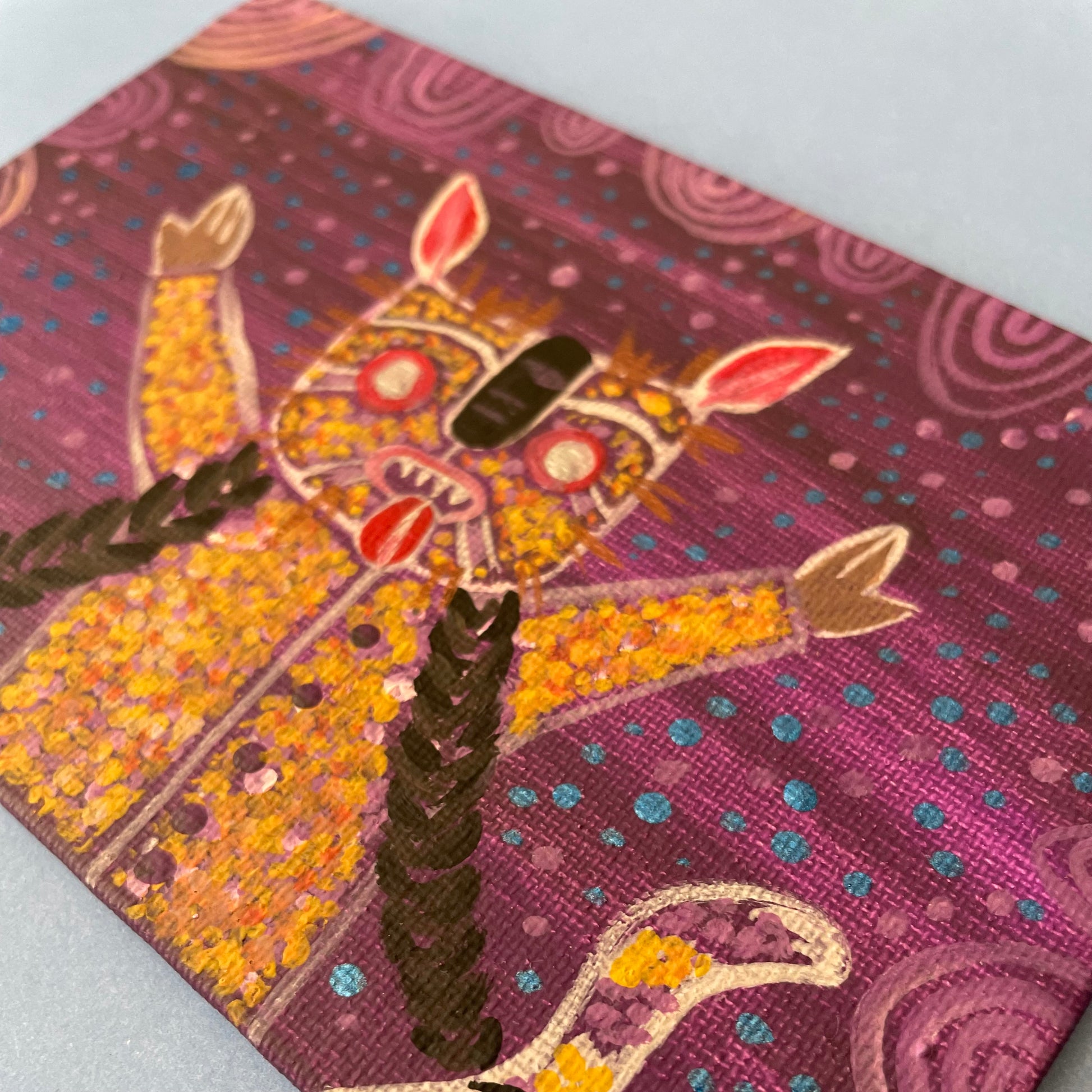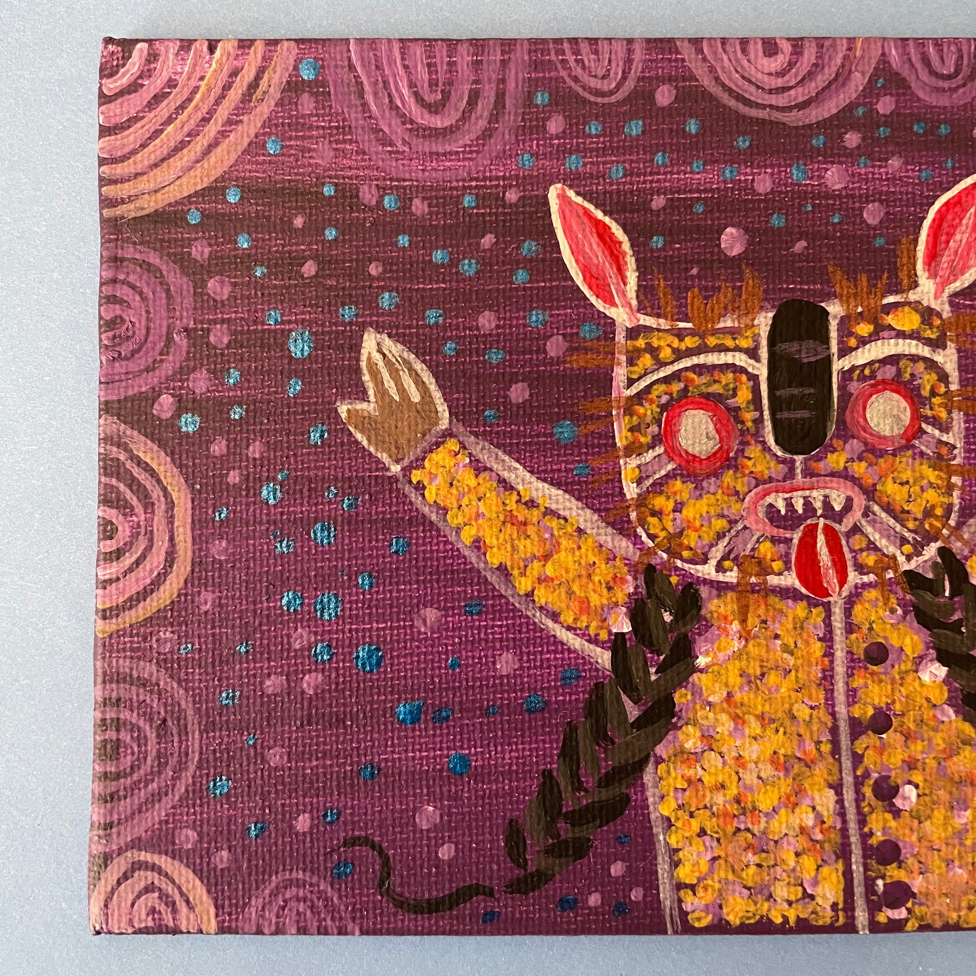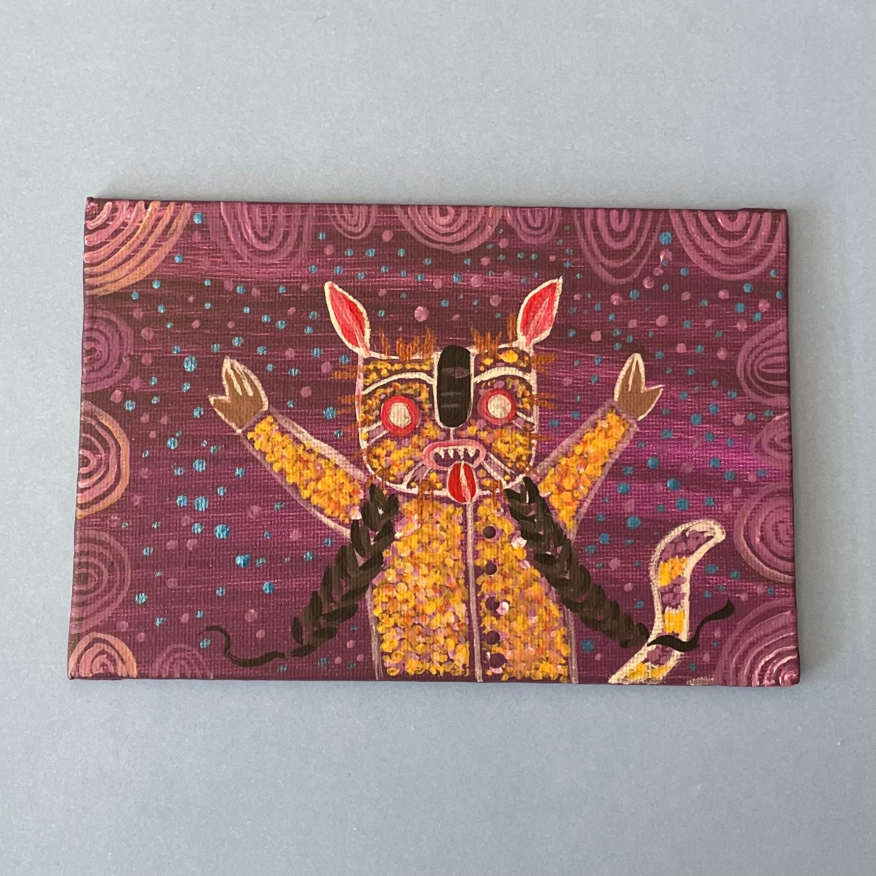 This piece “Tecuani in the rain” was painted on a flat canvas using acrylic paints. Tiny paintings for art collectors that have limited space. I have always loved painting as much as I love to sew.