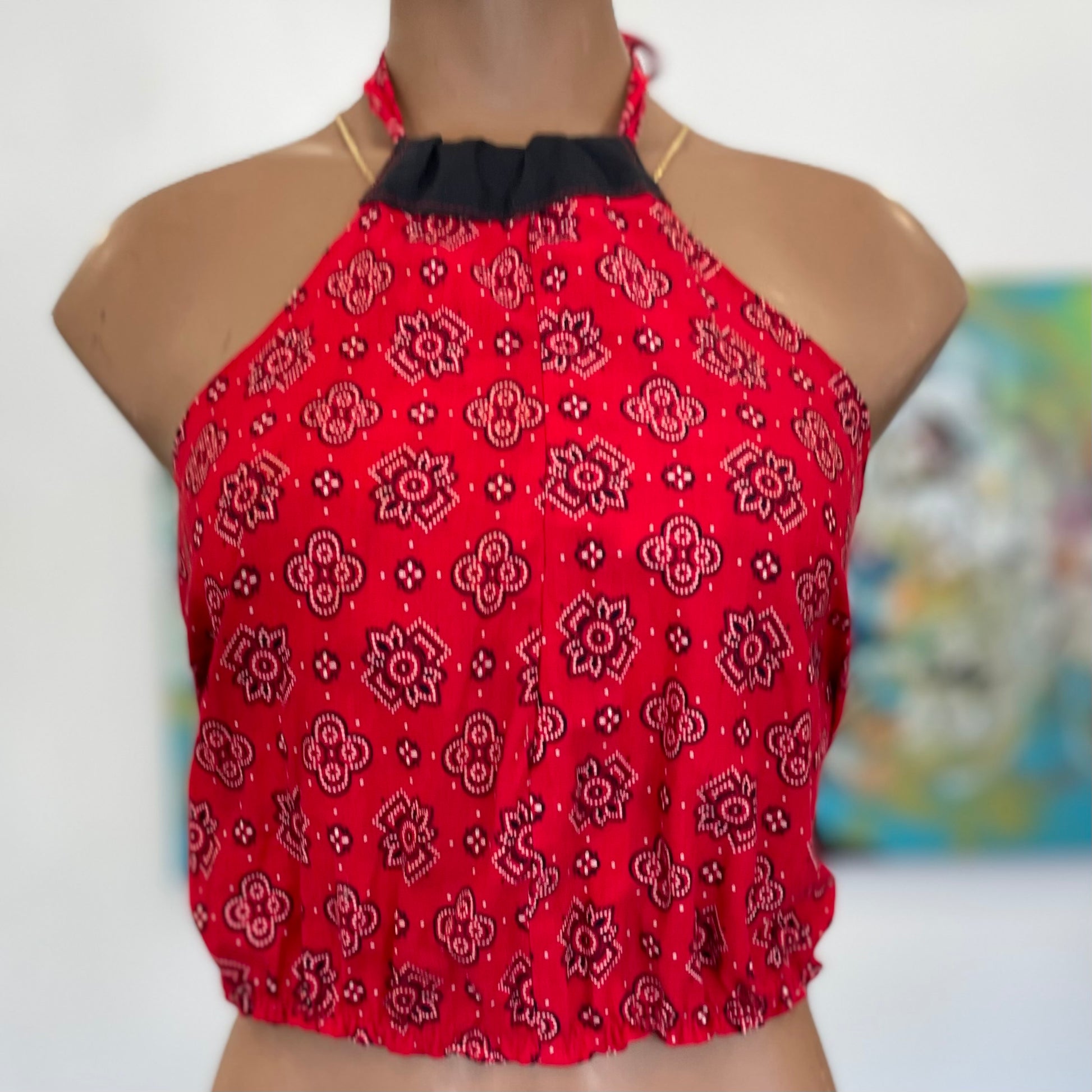 Handmade halter top made from repurposed cotton fabrics. 100% pre-shrunk cotton. Ties on back