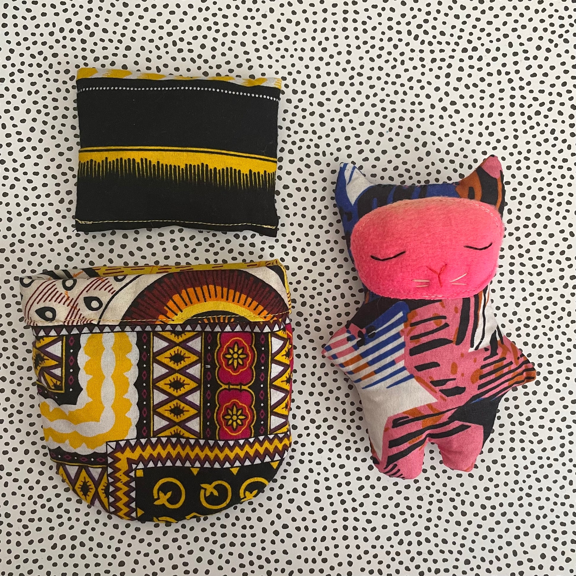 This Happy Vibes Kitty sleeping set is handmade and filled with fabric remnants. Face is hand painted. Set comes with a kitty, a pillow, and a reversible blanket.