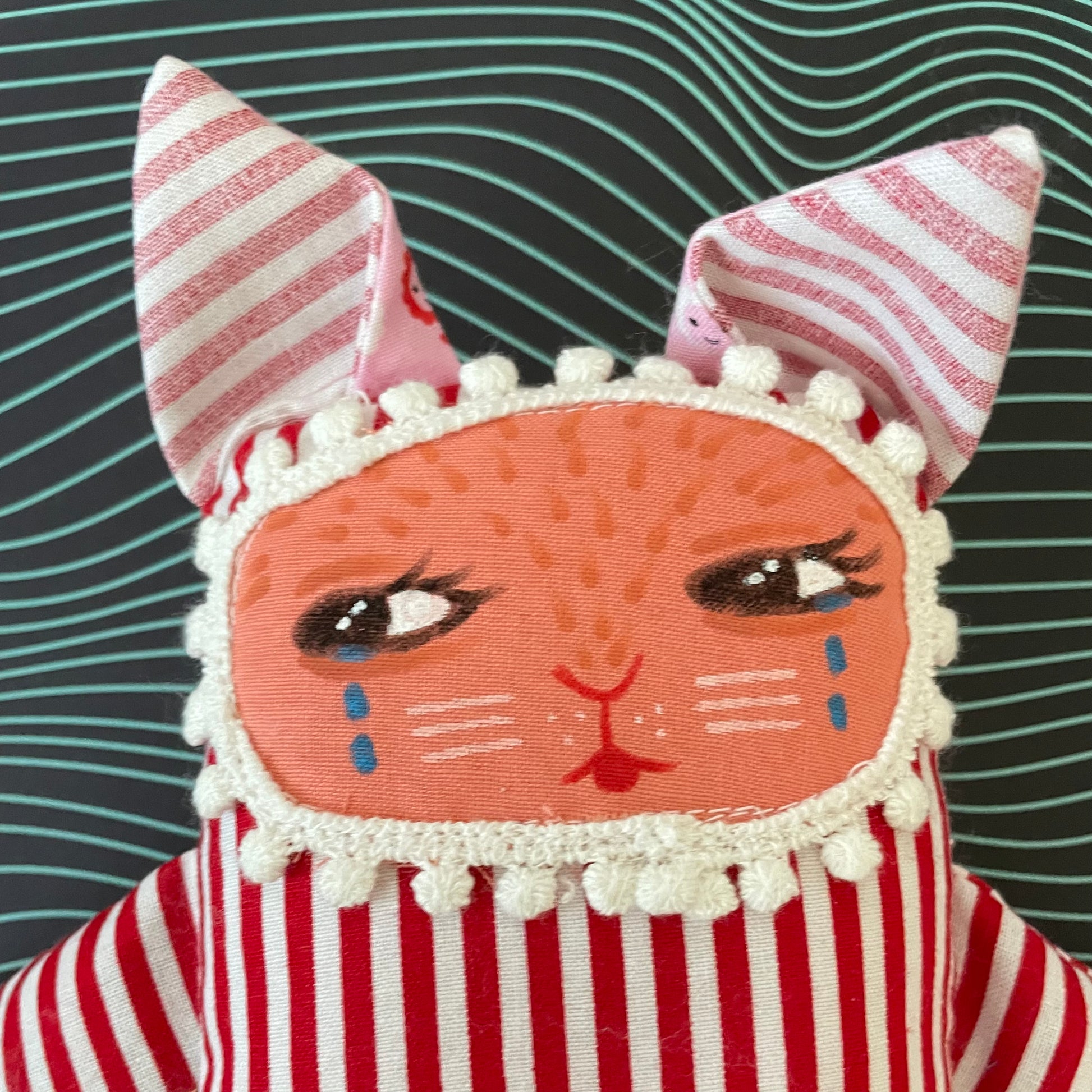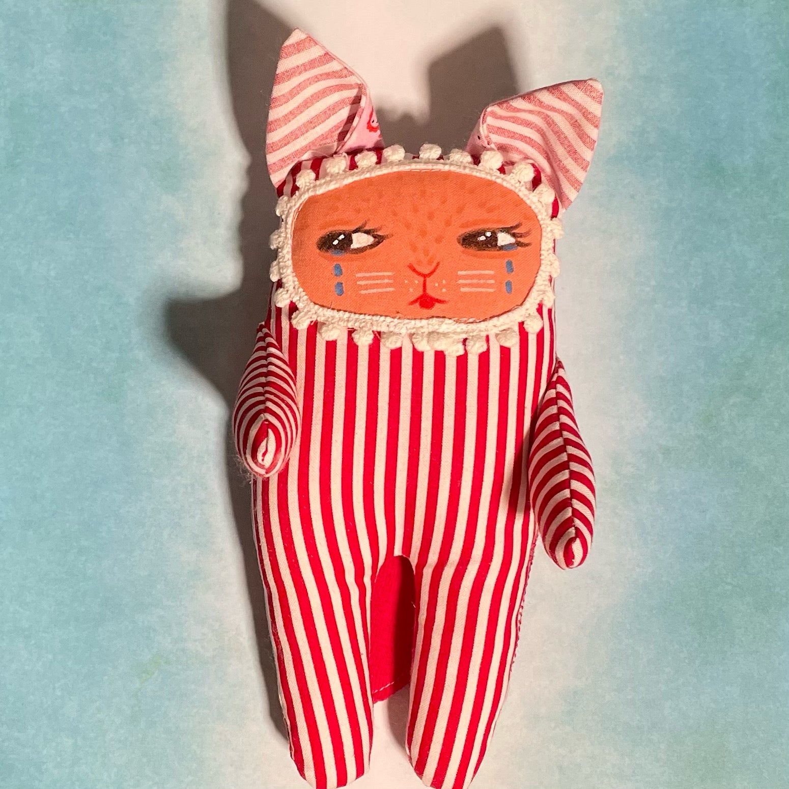 This Kitty has a hand painted face and made from fabric remnants. Recommend for3 years and up. Great gift for kitty lovers!