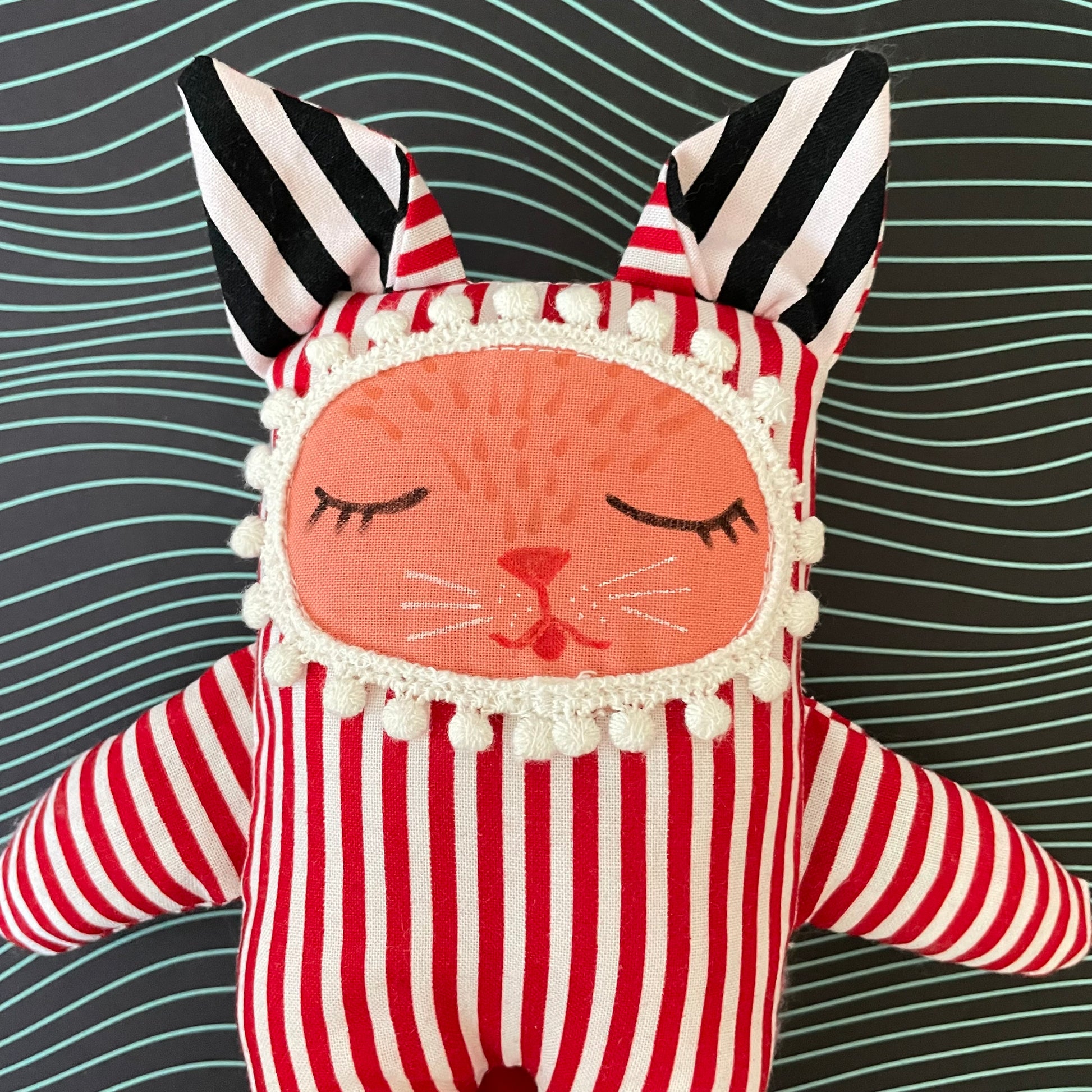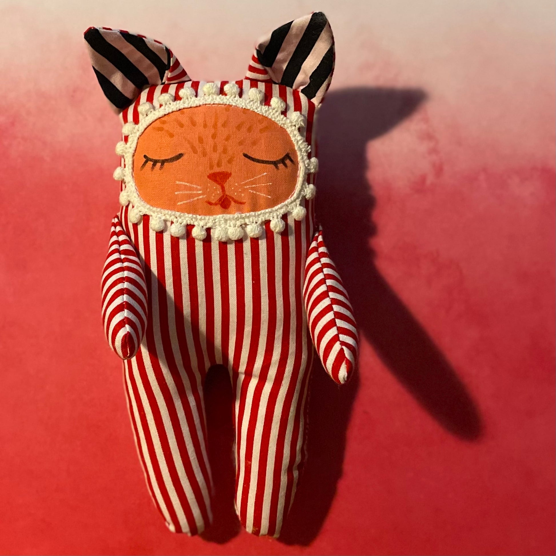 This Kitty has a hand painted face and made from fabric remnants. Recommend for3 years and up. Great gift for kitty lovers!
