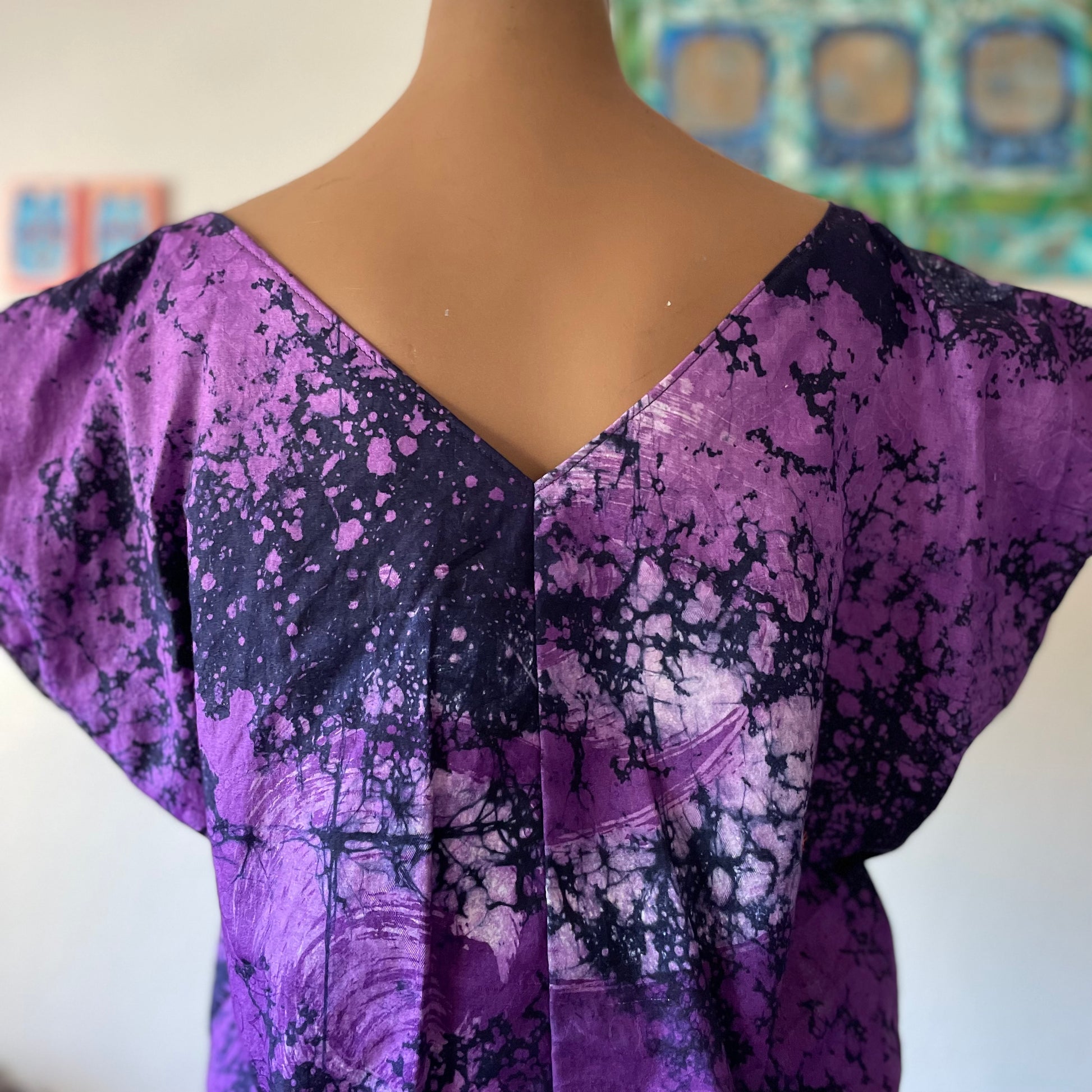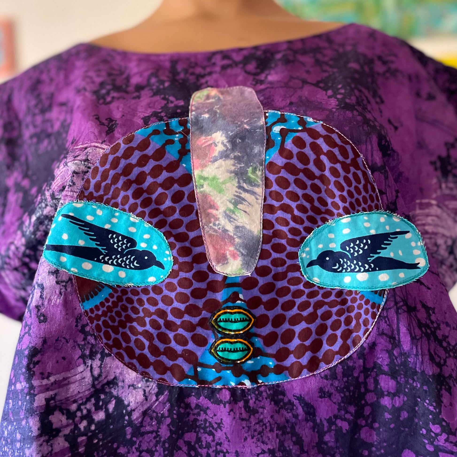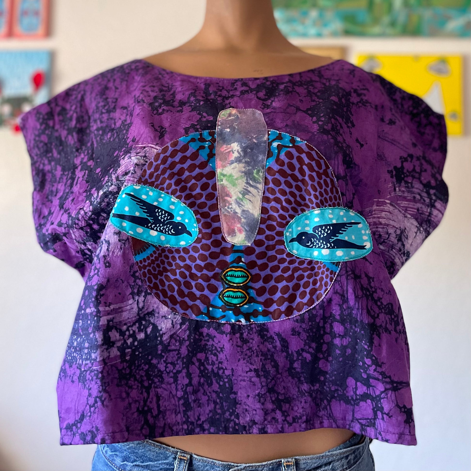 Handmade top made from handmade Nigerian batiks fabrics. 100% pre-shrunk cotton. Has a face appliqué on front.