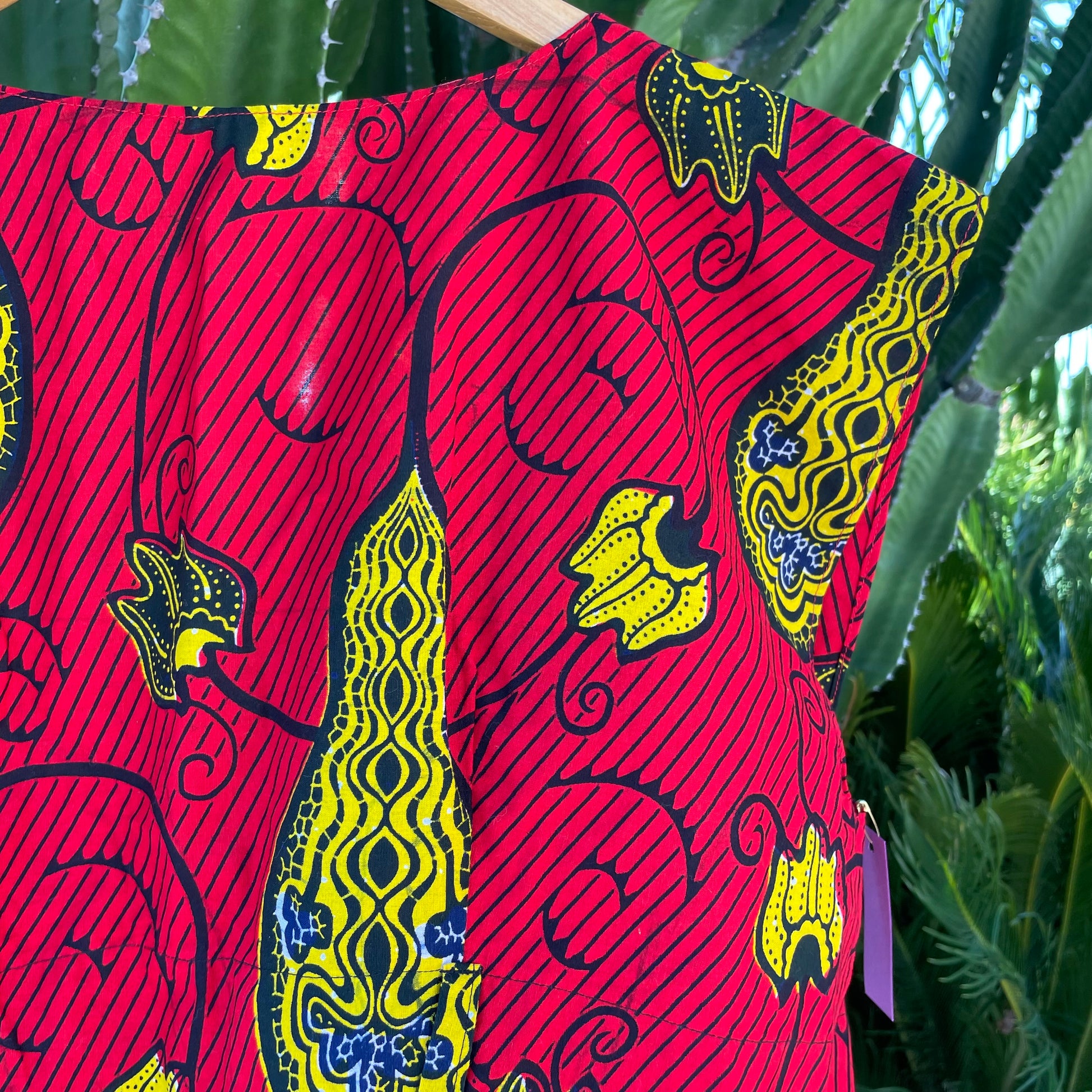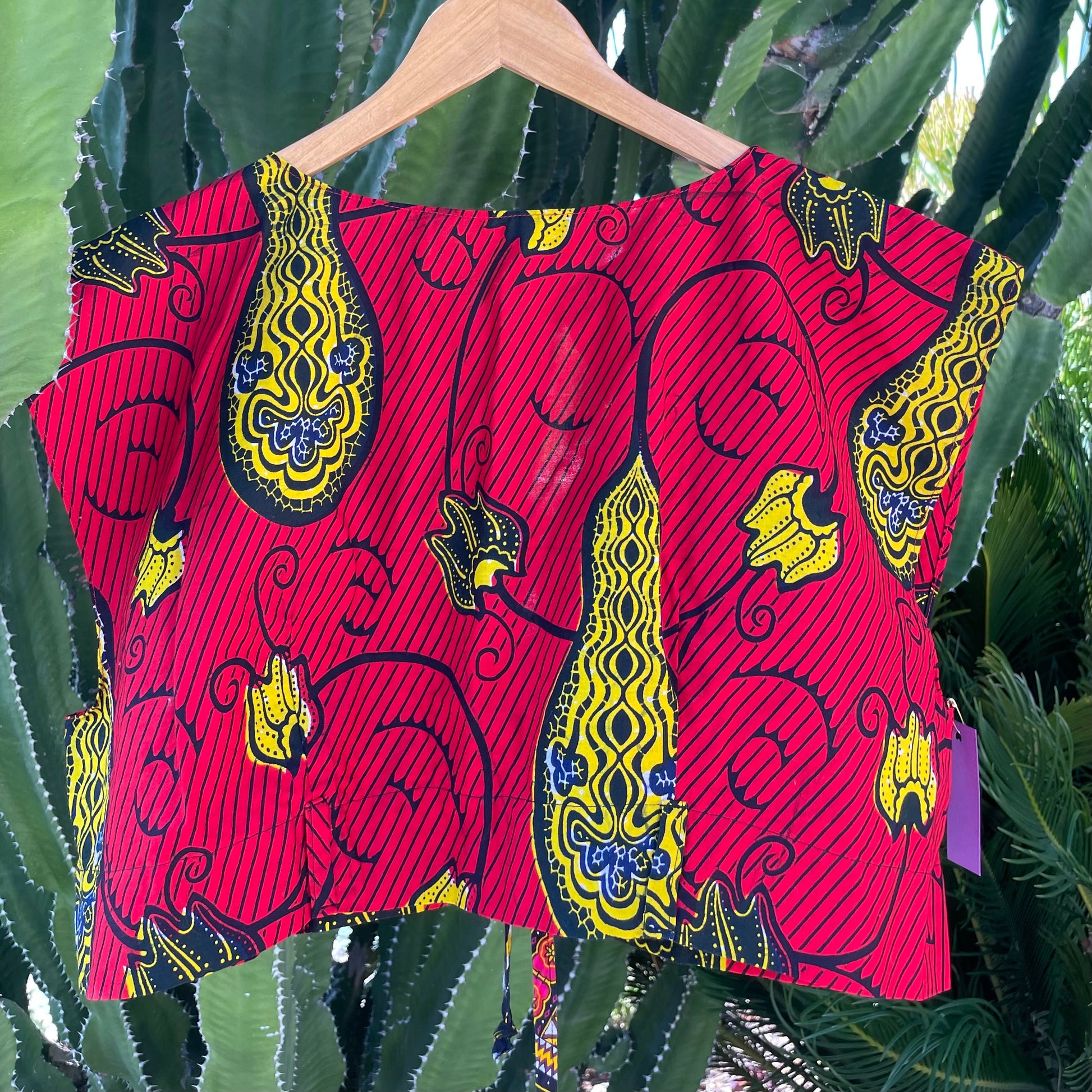 Handmade top made from repurposed African wax fabrics. 100% pre-shrunk cotton. Ties in back.