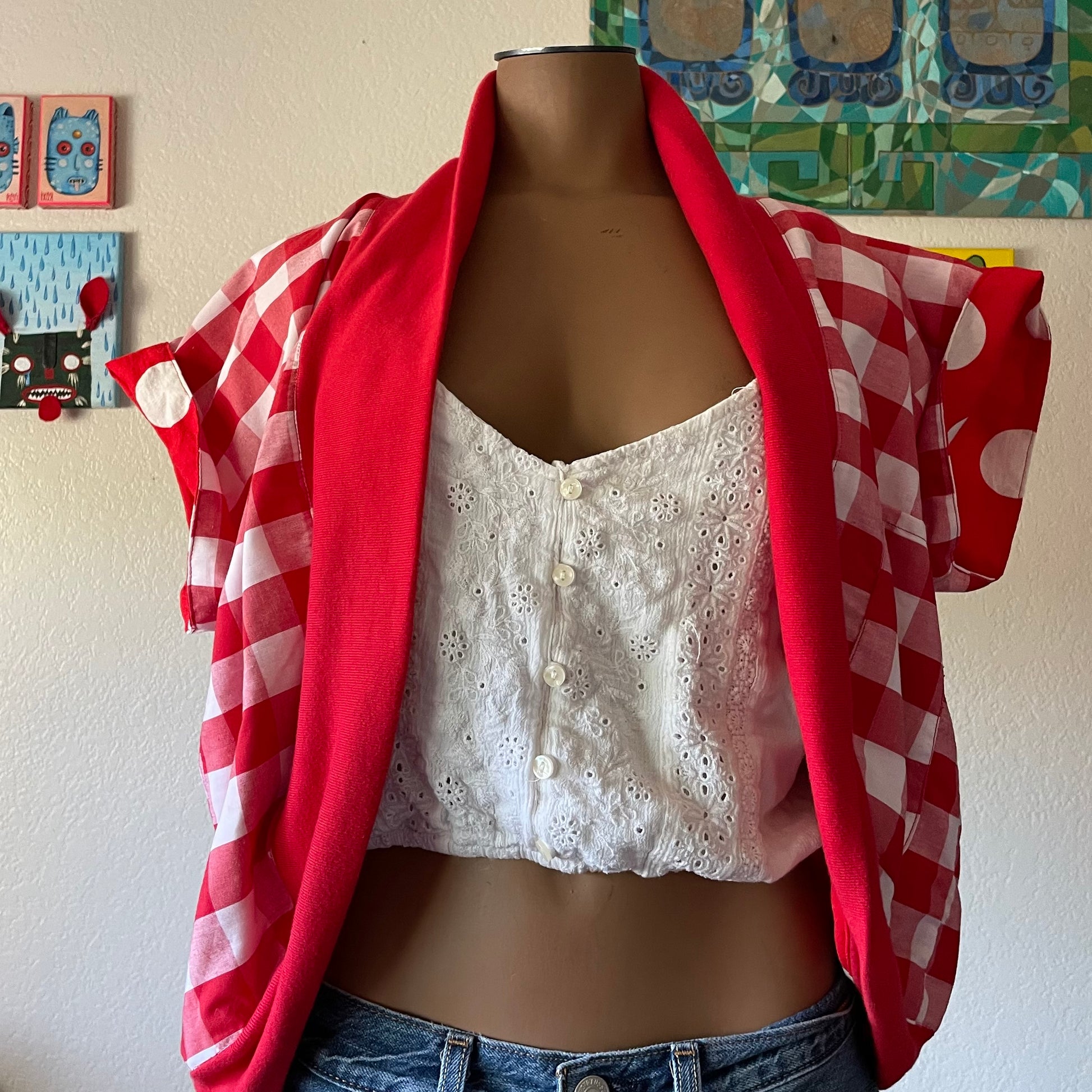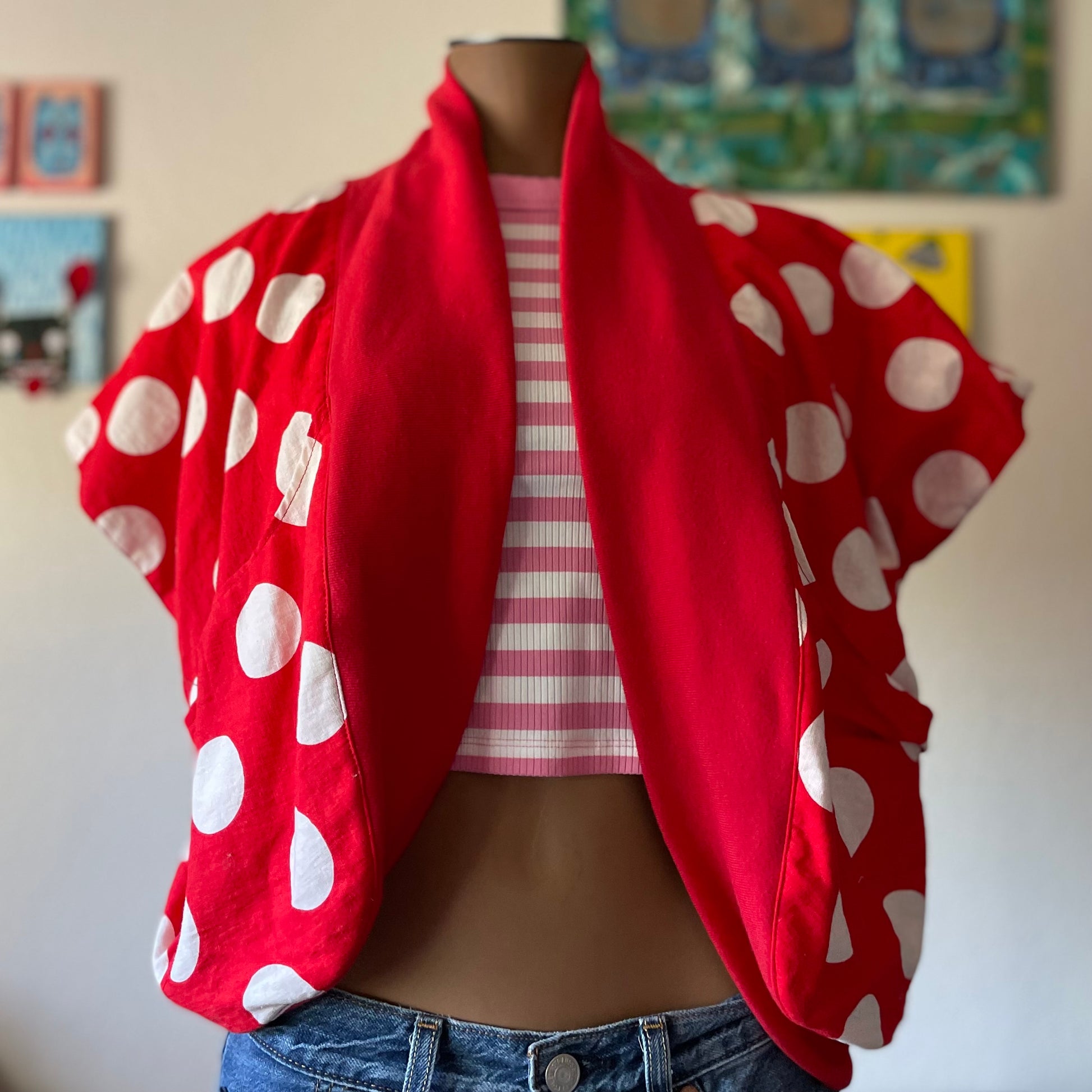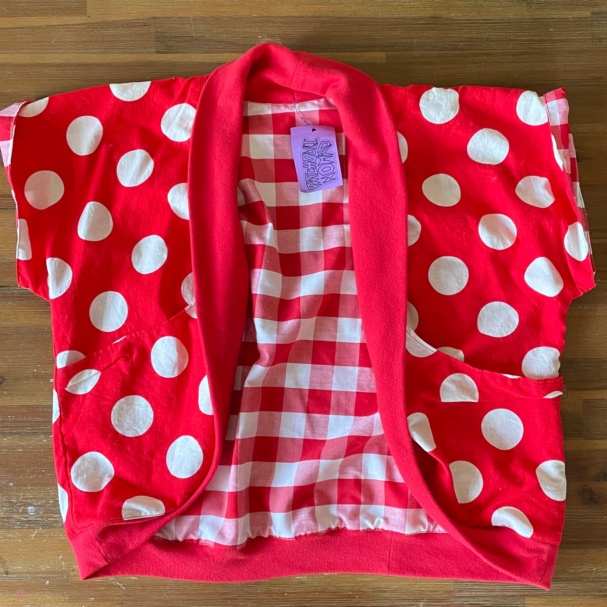 This is a super cute reversible cover up for when it’s not too cold. Has pockets on each side. Made from limited & repurposed fabrics. All fabrics are pre-shrunk.