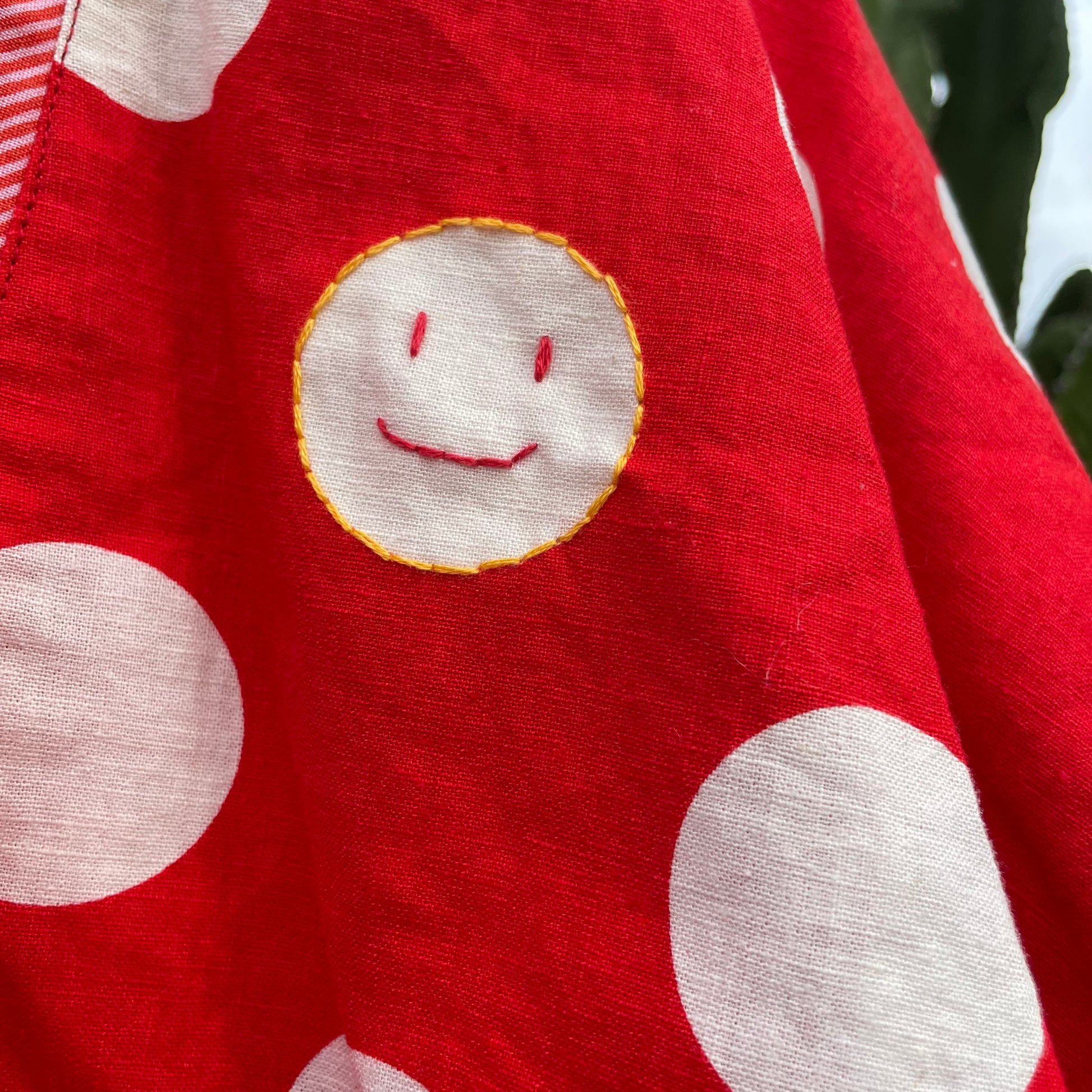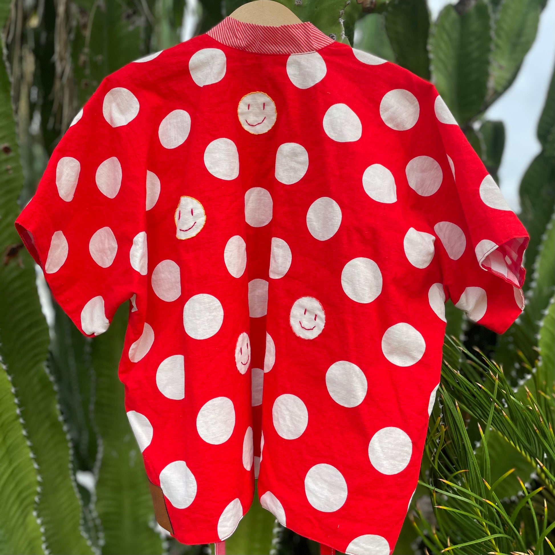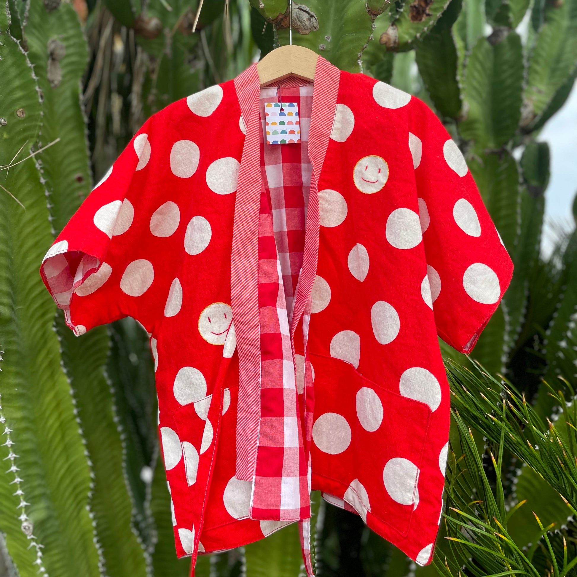 Handmade Mini Kimcho made from limited fabrics. Has pockets in the front. Find the happy faces in this Kimcho. Ties in front.