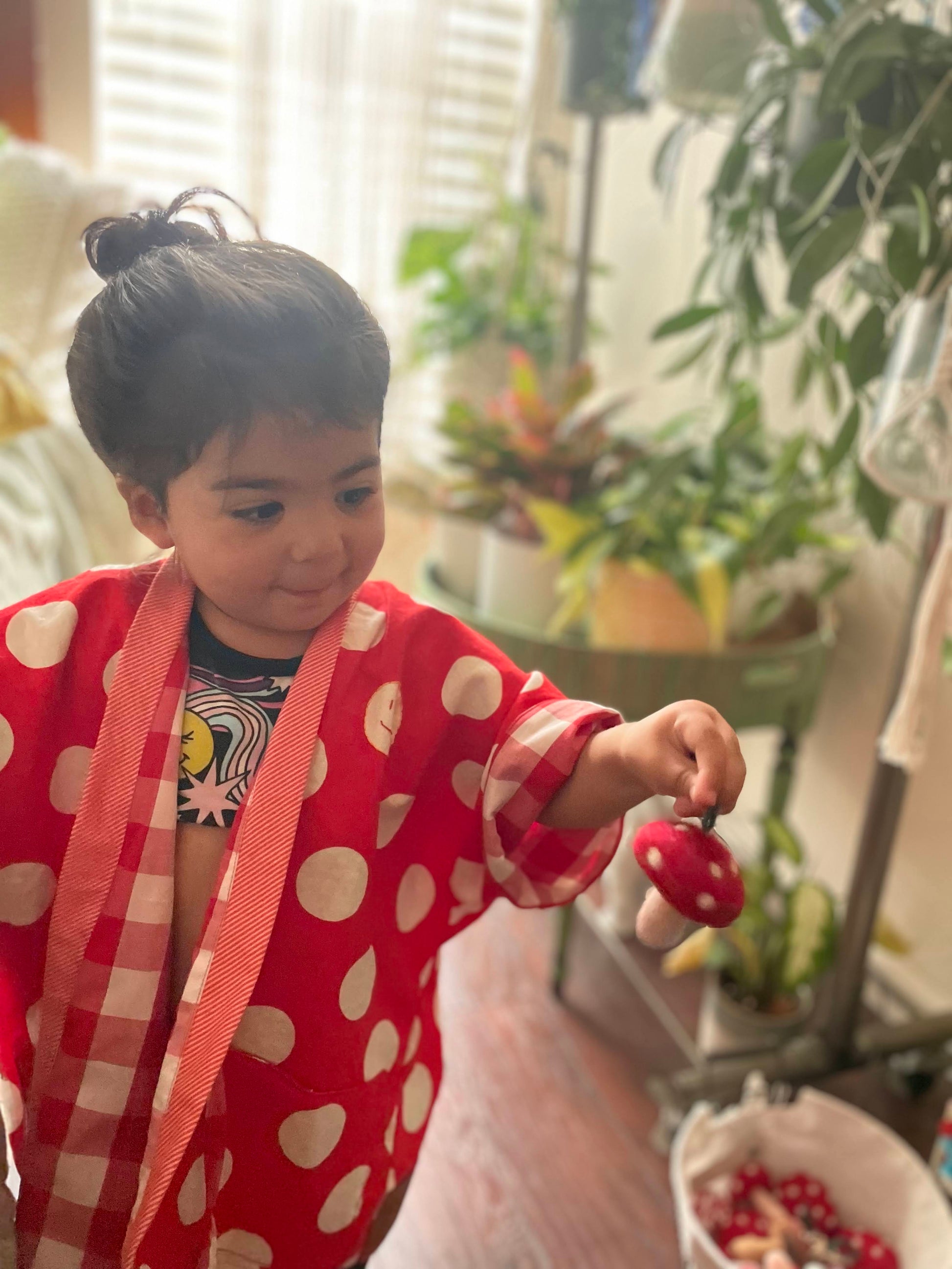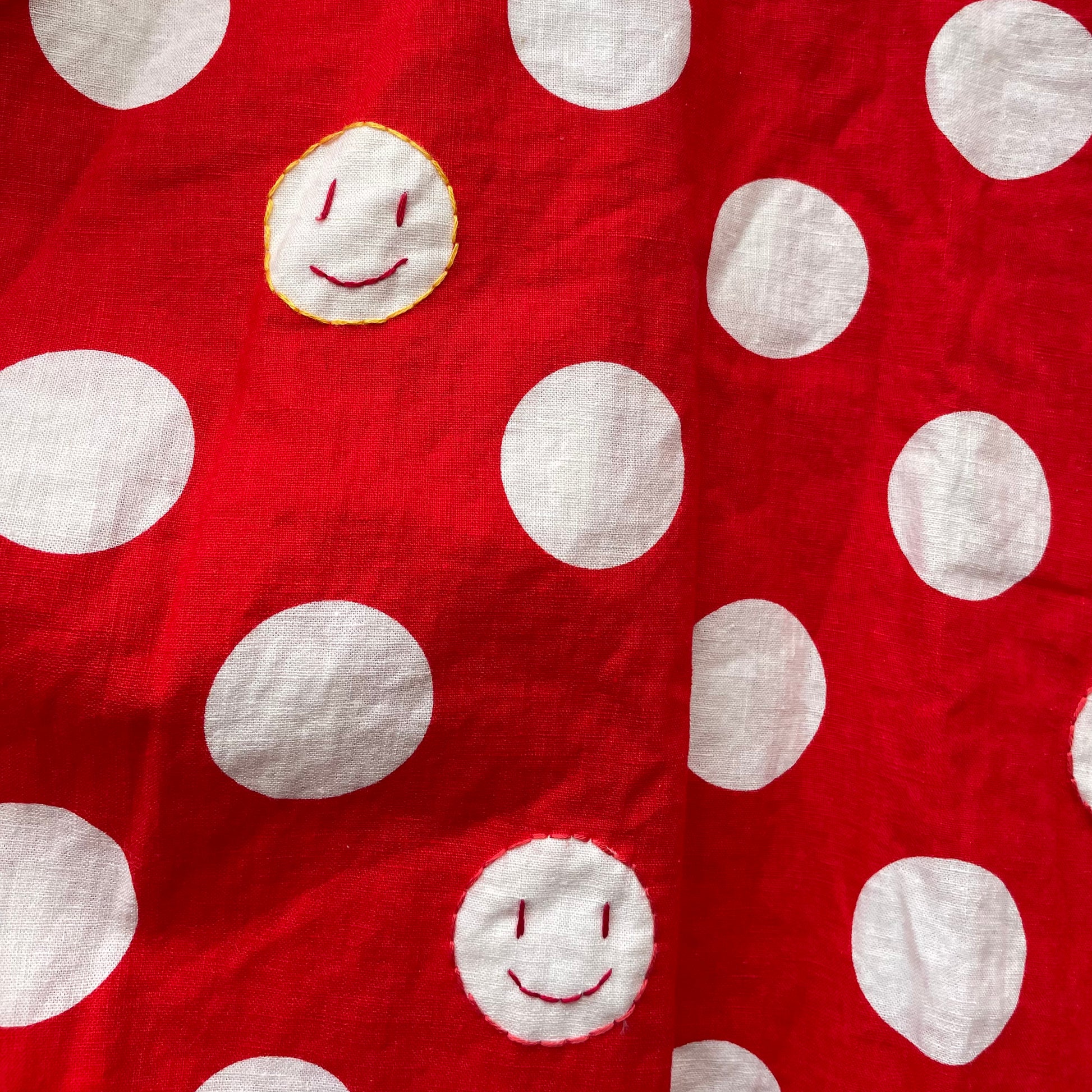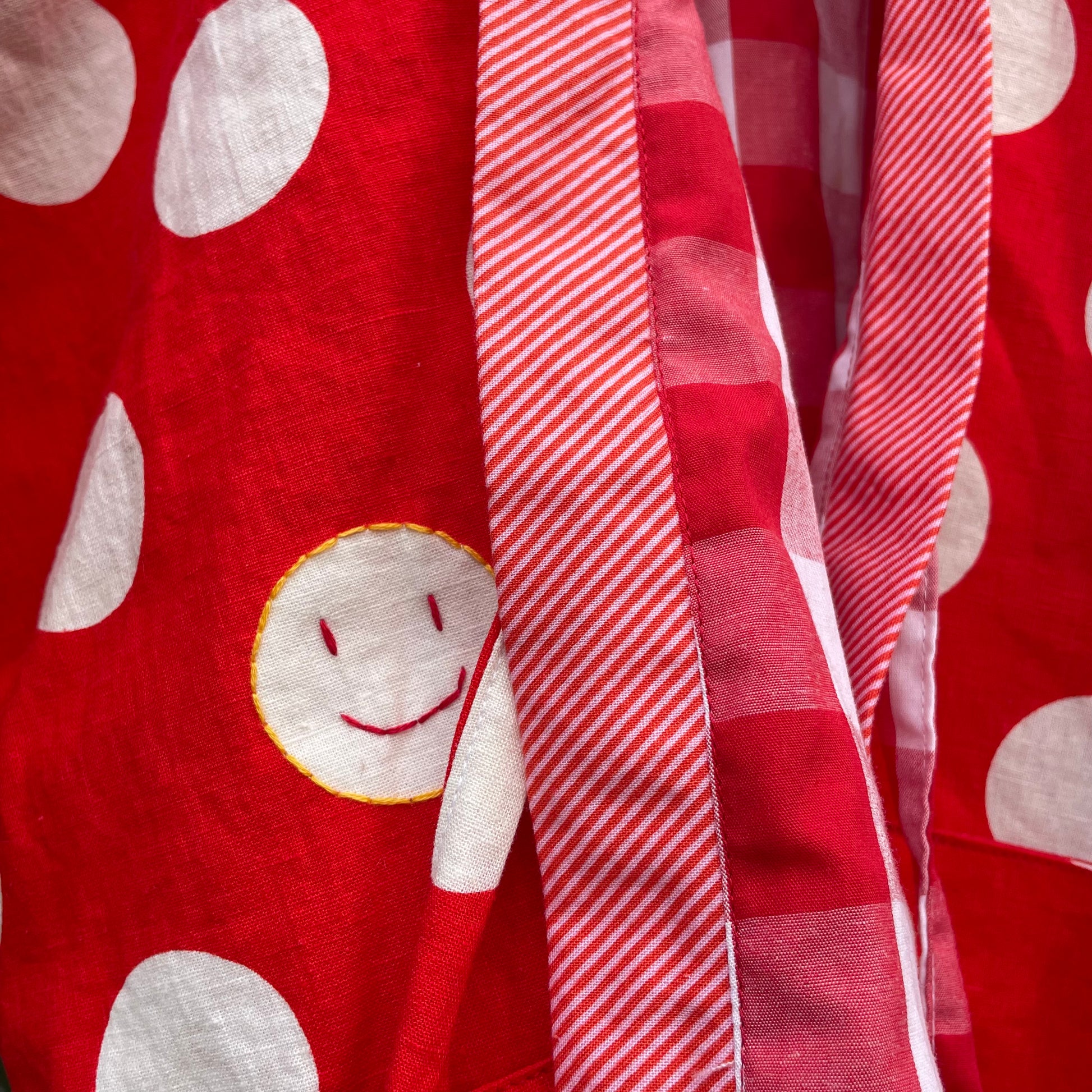 Handmade Mini Kimcho made from limited fabrics. Has pockets in the front. Find the happy faces in this Kimcho. Ties in front.