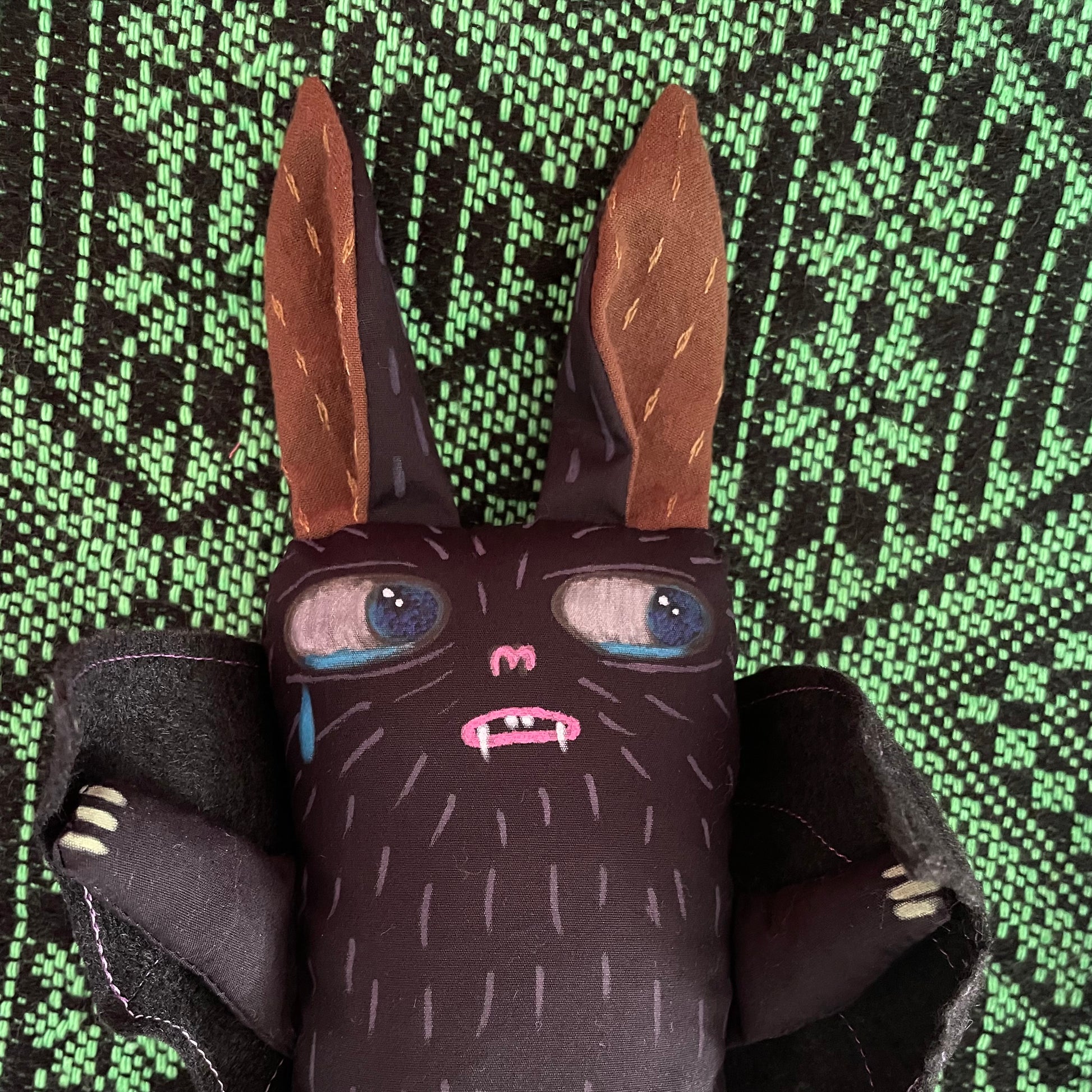 The Bat Baddie sometimes needs to cry. Each one is unique and their faces are hand painted. They are all made and filled with fabric remnants. Makes a great gift for bat lovers.