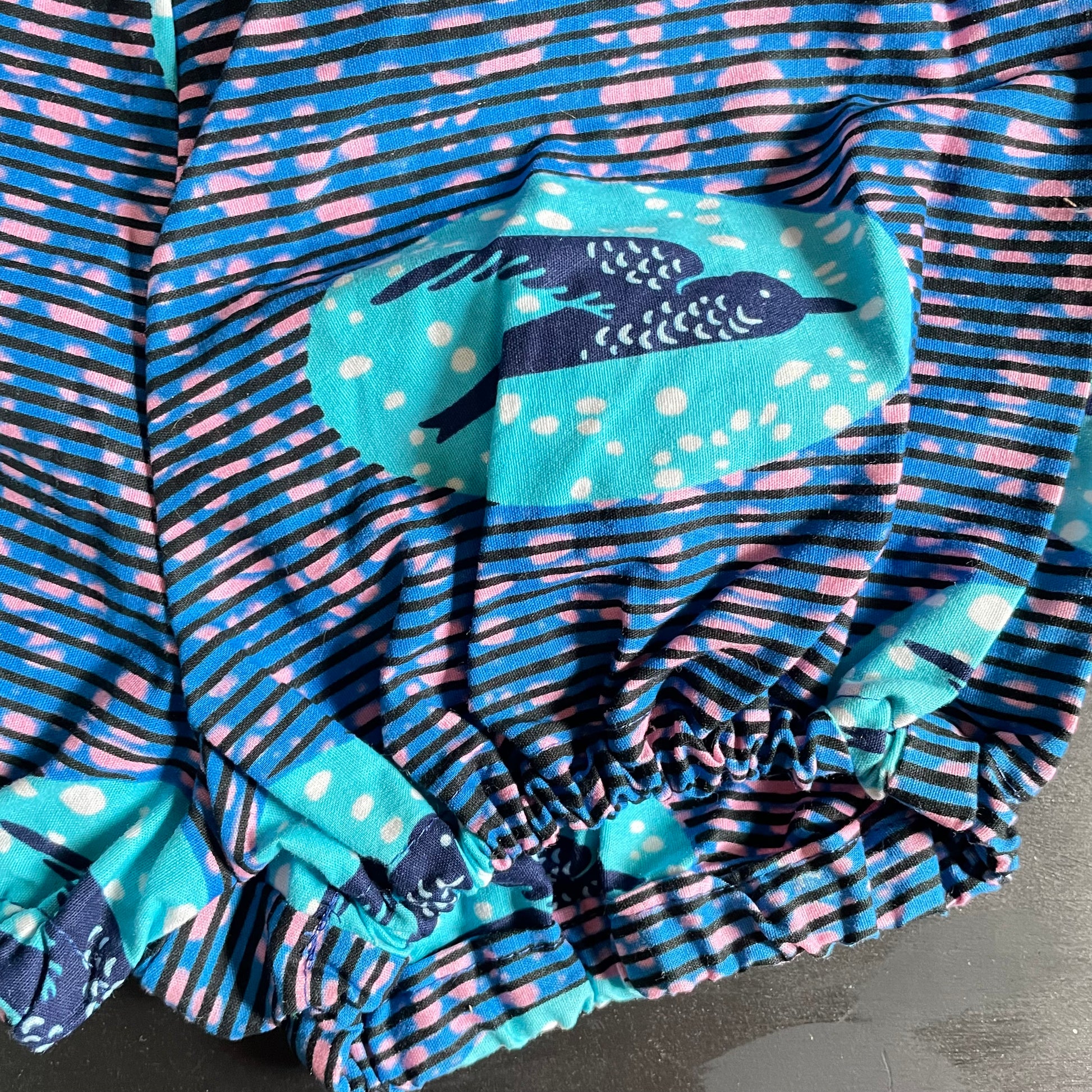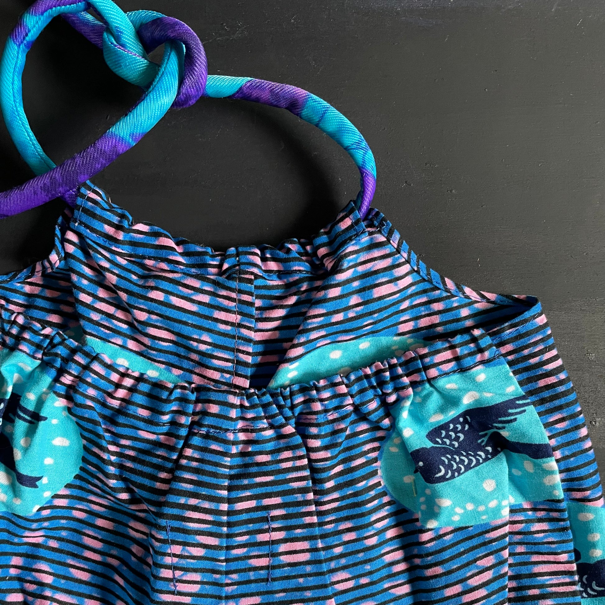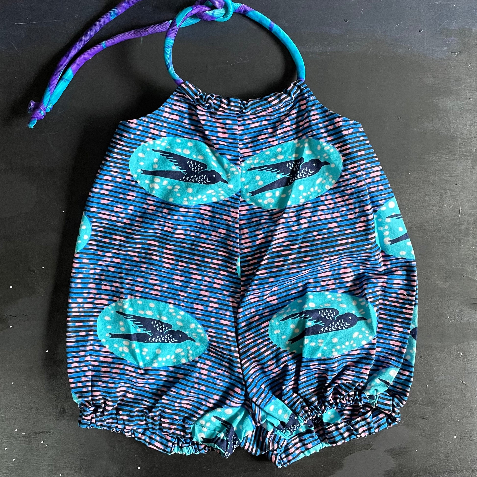 These are handmade short rompers made from repurposed, dead stock,vintage and limited fabrics. Ties on neck area like a halter. Elastic on thigh area and back. All fabrics pre shrunk and 100% cotton.