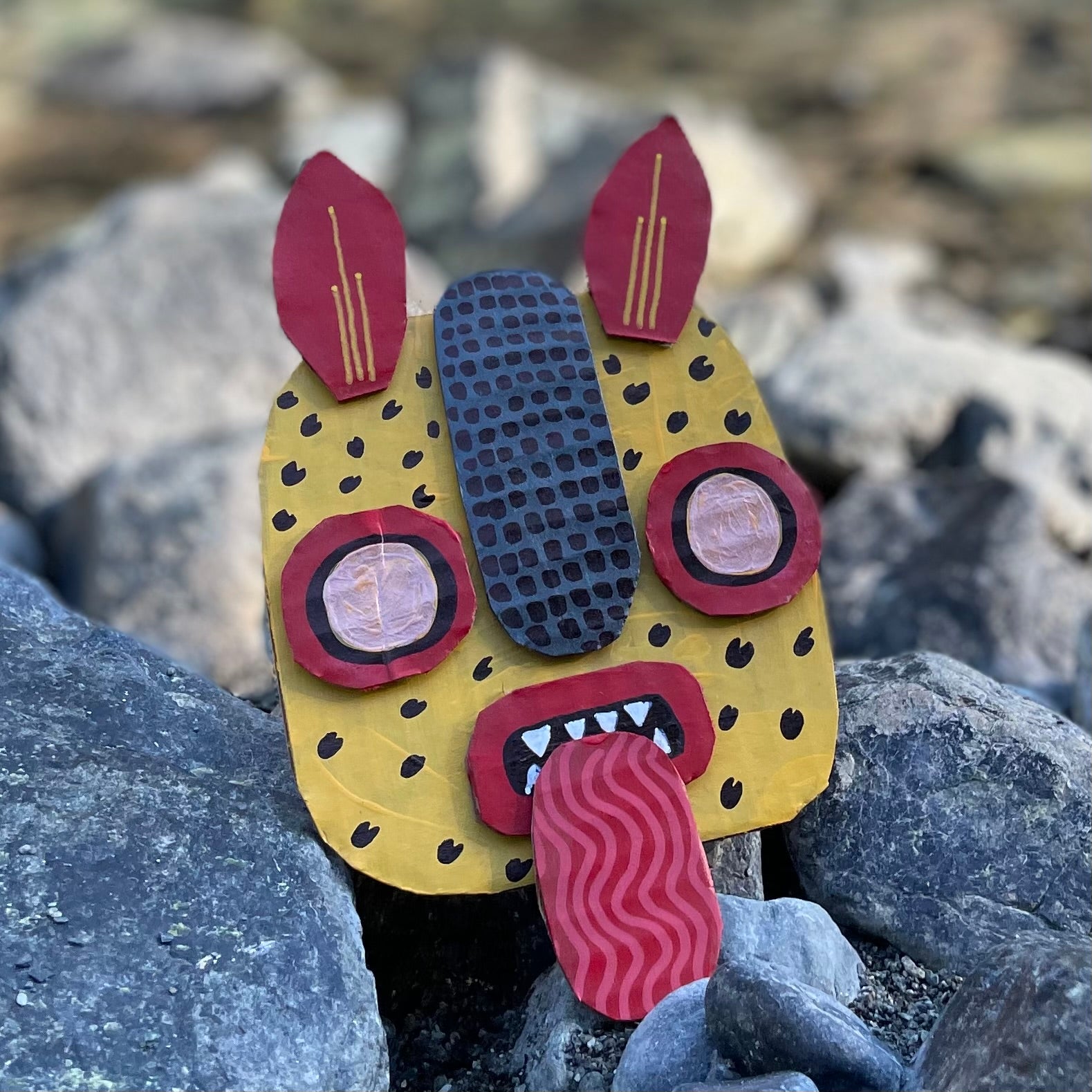 This piece “Tecuani” was painted on repurposed cardboard using acrylic paints. I have always loved painting as much as I love to sew. You can hang on wall. Has a string to hang.