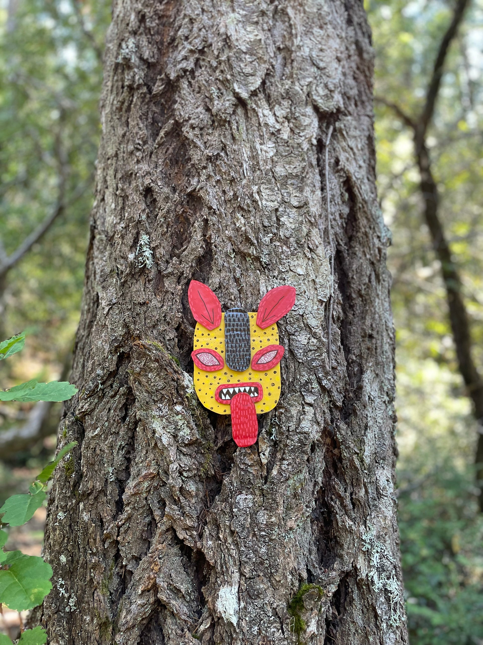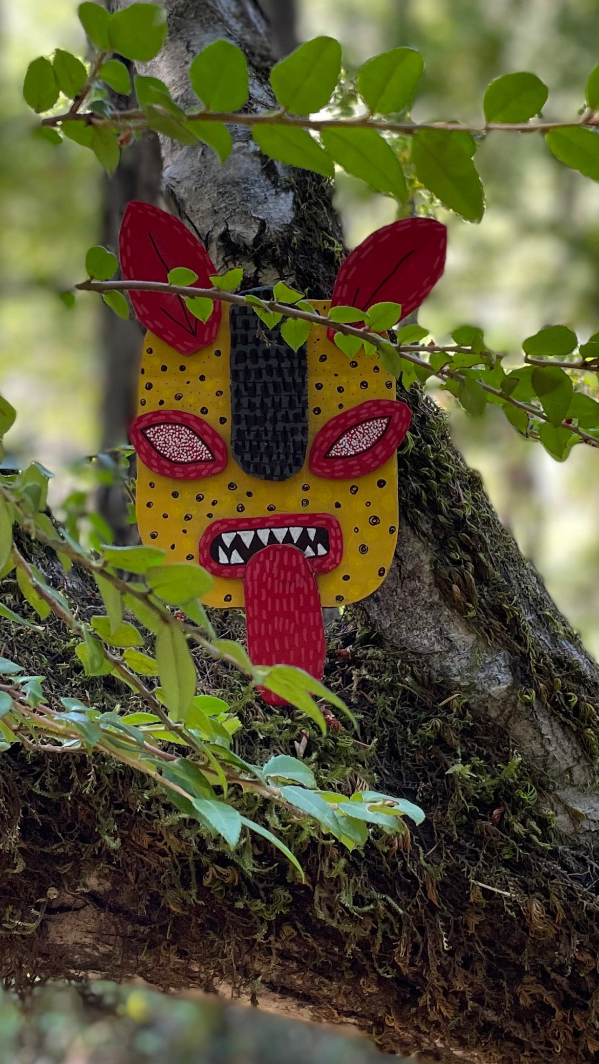 This piece “Tecuani” was painted on repurposed cardboard using acrylic paints. I have always loved painting as much as I love to sew. You can hang on wall. Has a string to hang.