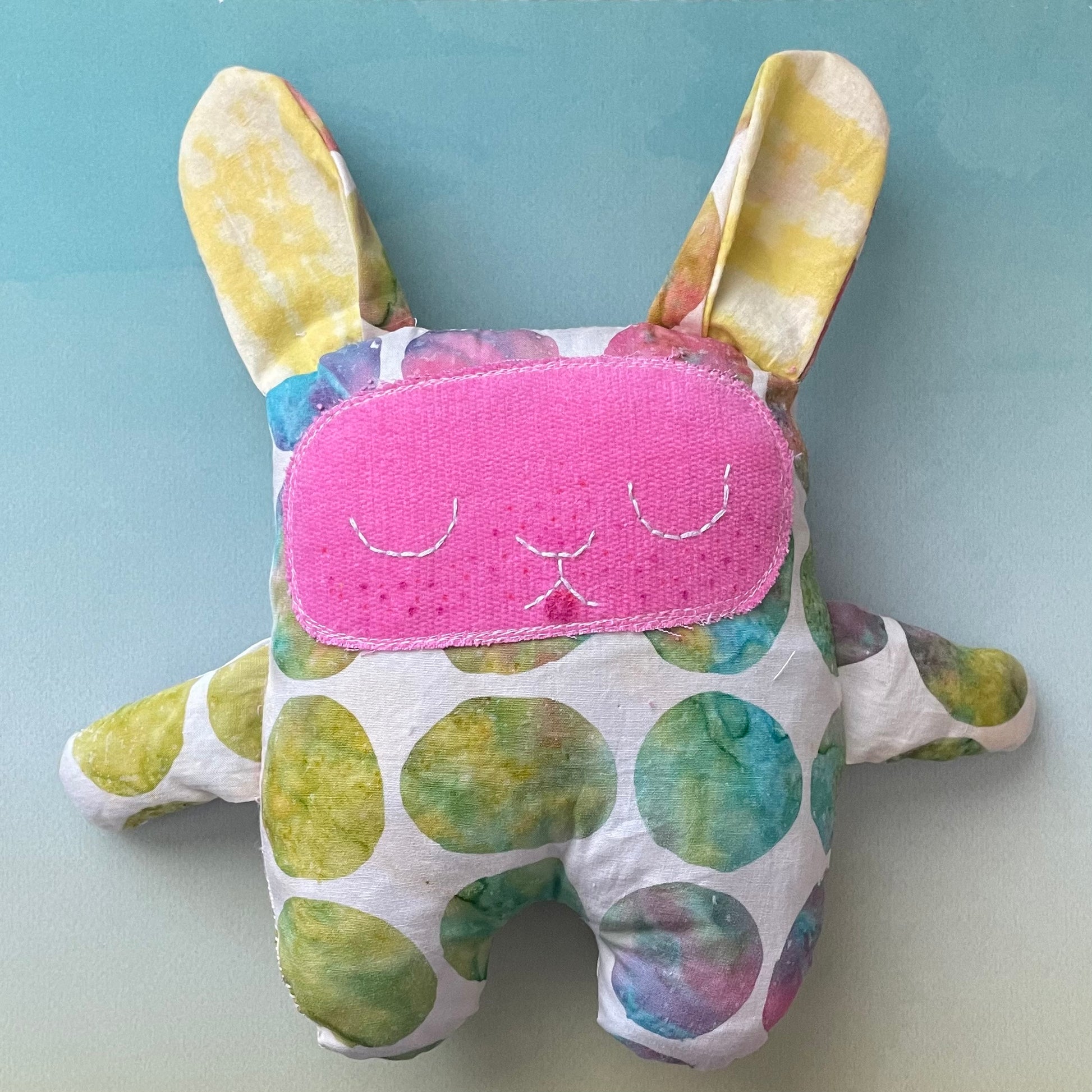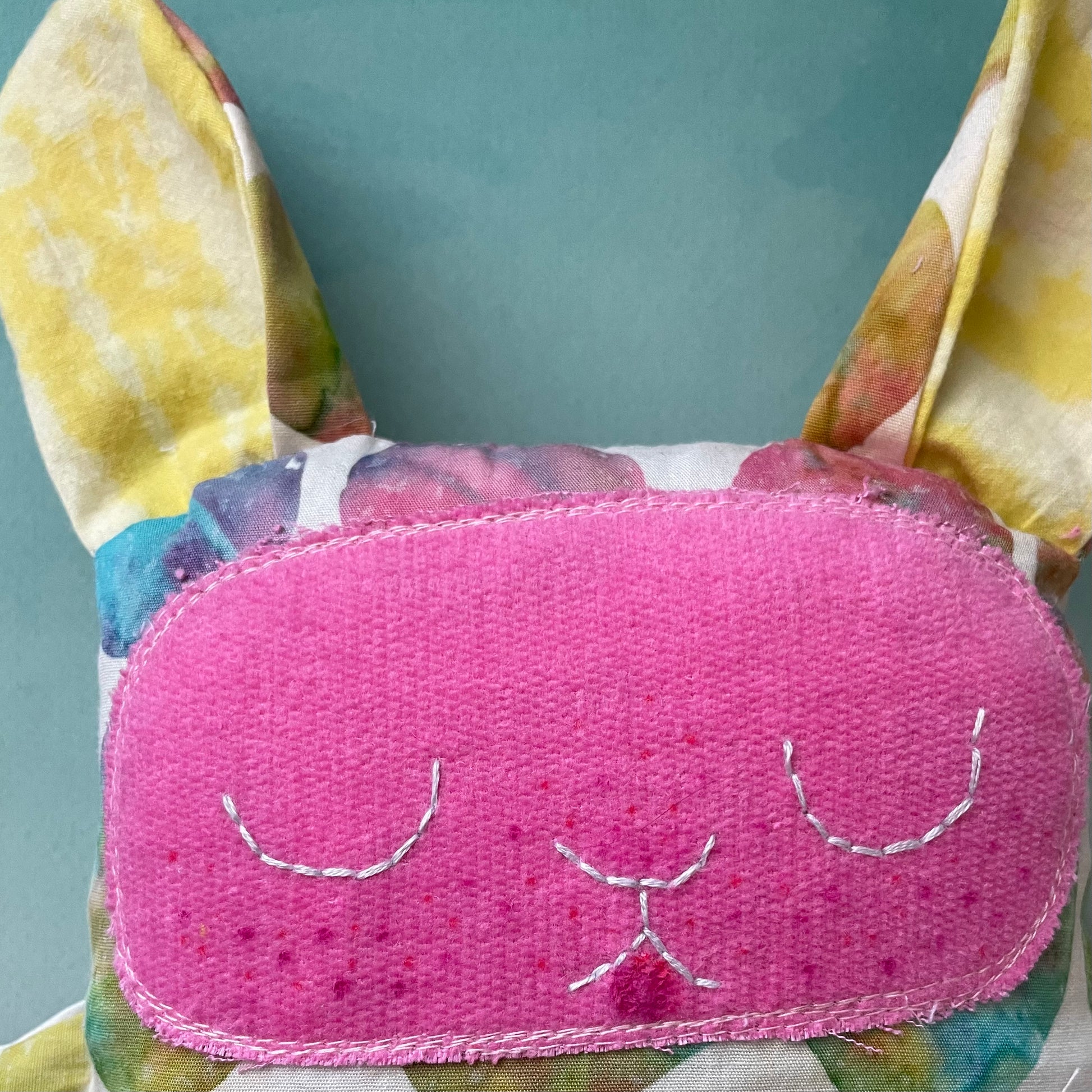 This bunny has a hand stitched face and made from fabric remnants. Recommend for 3 years and up. Great gift for bunny lovers!